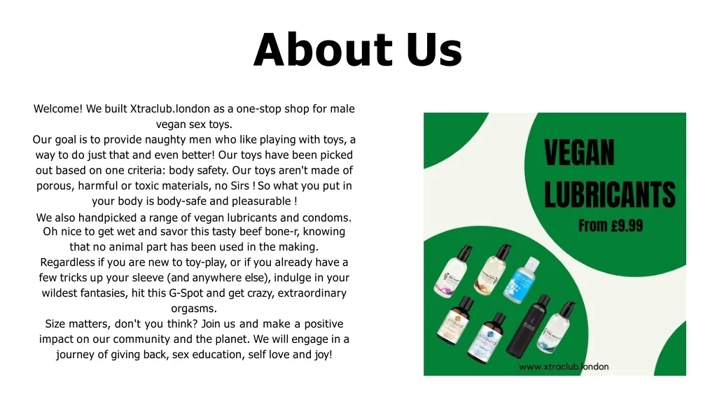 AboutUs Welcome!WebuiltXtraclub.londonasaone-stopshopformale vegansextoys. Ourgoalistoprovidenaughtymenwholikeplayingwithtoys,a waytodojustthatandevenbetter!Ourtoyshavebeenpicked outbasedononecriteria:bodysafety.Ourtoysaren'tmadeof porous,harmfulortoxicmaterials,noSirs!Sowhatyouputin yourbodyisbody-safeandpleasurable! Wealsohandpickedarangeofveganlubricantsandcondoms. Ohnicetogetwetandsavorthistastybeefbone-r,knowing thatnoanimalparthasbeenusedinthemaking. Regardlessifyouarenewtotoy-play,orifyoualreadyhavea fewtricksupyoursleeve(andanywhereelse),indulgeinyour wildestfantasies,hitthisG-Spotandgetcrazy,extraordinary orgasms. Size matters, don't you think? Join us and make a positive impactonourcommunityandtheplanet.Wewillengageina journeyofgivingback,sexeducation,selfloveandjoy!