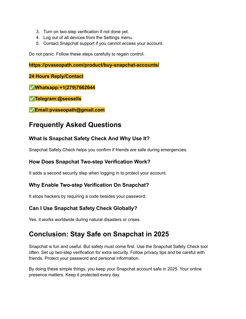 3. Turn on two-step verification if not done yet. 4. Log out of all devices from the Settings menu. 5. Contact Snapchat support if you cannot access your account. Do not panic. Follow these steps carefully to regain control. https://pvaseopath.com/product/buy-snapchat-accounts/ 24 Hours Reply/Contact ✅Whatsapp:+1(279)7662644 ✅Telegram:@seosells ✅Email:pvaseopath@gmail.com Frequently Asked Questions What Is Snapchat Safety Check And Why Use It? Snapchat Safety Check helps you confirm if friends are safe during emergencies. How Does Snapchat Two-step Verification Work? It adds a second security step when logging in to protect your account. Why Enable Two-step Verification On Snapchat? It stops hackers by requiring a code besides your password. Can I Use Snapchat Safety Check Globally? Yes, it works worldwide during natural disasters or crises. Conclusion: Stay Safe on Snapchat in 2025 Snapchat is fun and useful. But safety must come first. Use the Snapchat Safety Check tool often. Set up two-step verification for extra security. Follow privacy tips and be careful with friends. Protect your password and personal information. By doing these simple things, you keep your Snapchat account safe in 2025. Your online presence matters. Keep it protected every day.