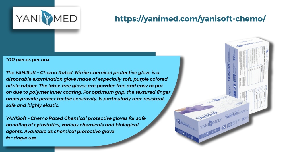 https://yanimed.com/yanisoft-chemo/ 100 pieces per box The YANISoft – Chemo Rated Nitrile chemical protective glove is a disposable examination glove made of especially soft, purple colored nitrile rubber. The latex-free gloves are powder-free and easy to put on due to polymer inner coating. For optimum grip, the textured finger areas provide perfect tactile sensitivity. Is particularly tear-resistant, safe and highly elastic. YANISoft – Chemo Rated Chemical protective gloves for safe handling of cytostatics, various chemicals and biological agents. Available as chemical protective glove for single use