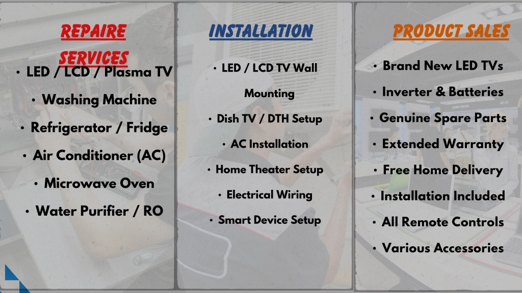 Repaire Services Installation Product Sales • LED / LCD TV Wall Mounting • Dish TV / DTH Setup • AC Installation • Home Theater Setup • Electrical Wiring • Smart Device Setup • LED / LCD / Plasma TV • Washing Machine • Refrigerator / Fridge • Air Conditioner (AC) • Microwave Oven • Water Purifier / RO • Brand New LED TVs • Inverter & Batteries • Genuine Spare Parts • Extended Warranty • Free Home Delivery • Installation Included • All Remote Controls • Various Accessories