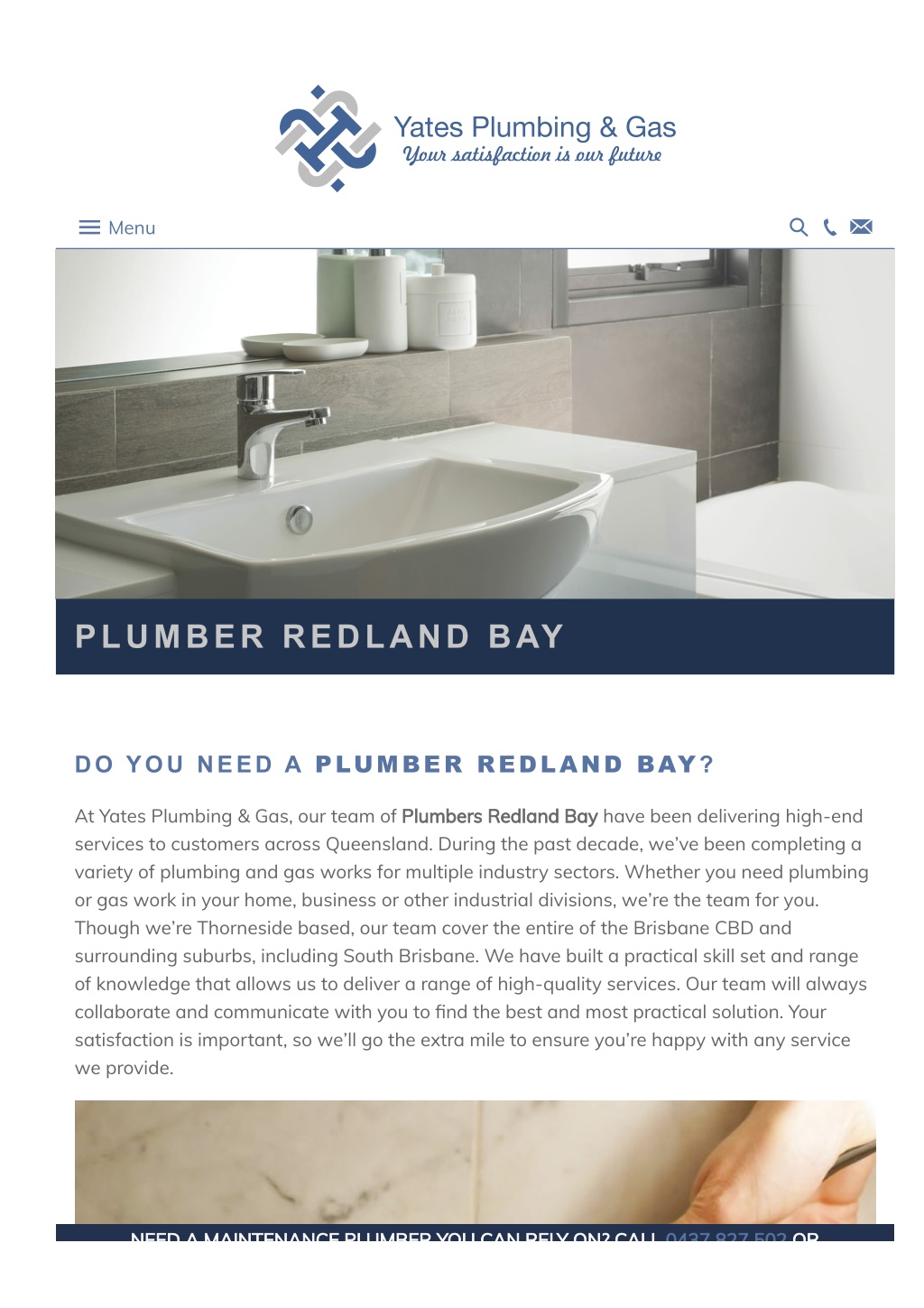 Menu PLUMBER REDLAND BAY DO YOU NEED A PLUMBER REDLAND BAY? At Yates Plumbing & Gas, our team of Plumbers Redland Bay services to customers across Queensland. During the past decade, we’ve been completing a variety of plumbing and gas works for multiple industry sectors. Whether you need plumbing or gas work in your home, business or other industrial divisions, we’re the team for you. Though we’re Thorneside based, our team cover the entire of the Brisbane CBD and surrounding suburbs, including South Brisbane. We have built a practical skill set and range of knowledge that allows us to deliver a range of high-quality services. Our team will always collaborate and communicate with you to 몭nd the best and most practical solution. Your satisfaction is important, so we’ll go the extra mile to ensure you’re happy with any service we provide. Plumbers Redland Bay have been delivering high-end NEED A MAINTENANCE PLUMBER YOU CAN RELY ON? CALL NEED A MAINTENANCE PLUMBER YOU CAN RELY ON? CALL 0437 827 502 0437 827 502 OR OR