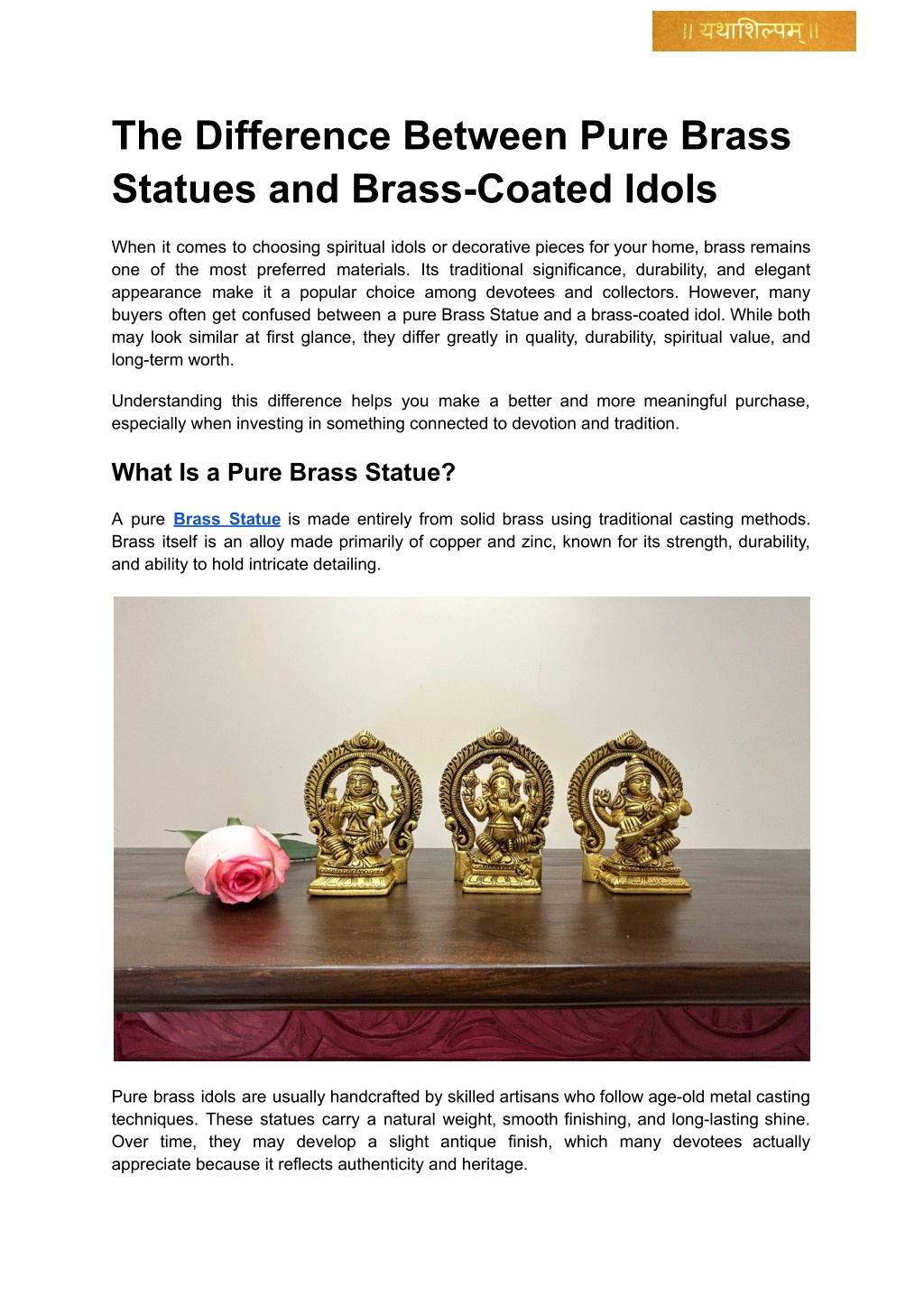 precision and cultural authenticity, ensuring each Brass Statue reflects devotion and craftsmanship. Brass-coated idols often rely on mass production techniques, which may limit fine detailing. Why Pure Brass Statues Are Often Preferred Many devotees and collectors prefer pure brass statues because they combine spiritual significance with long-term value. A genuine Brass Statue is not just a decorative item—it becomes a part of family traditions, often passed down through generations. Brass also adapts beautifully to both traditional and modern home décor, making it versatile for pooja rooms, living spaces, and gifting purposes. Choosing pure brass ensures you invest in something meaningful and durable rather than temporary. How to Identify a Pure Brass Statue If you are planning to purchase a brass idol, here are a few simple tips to help you identify authenticity: ● Check the weight: Pure brass statues are noticeably heavier. ● Observe the finish: Solid brass usually has a deeper, richer tone. ● Look for craftsmanship: Handcrafted detailing often indicates genuine metal work. ● Buy from trusted sources: Reputed brands like Yathashilpam ensure authenticity and quality. Why Choose Yathashilpam for Brass Statues