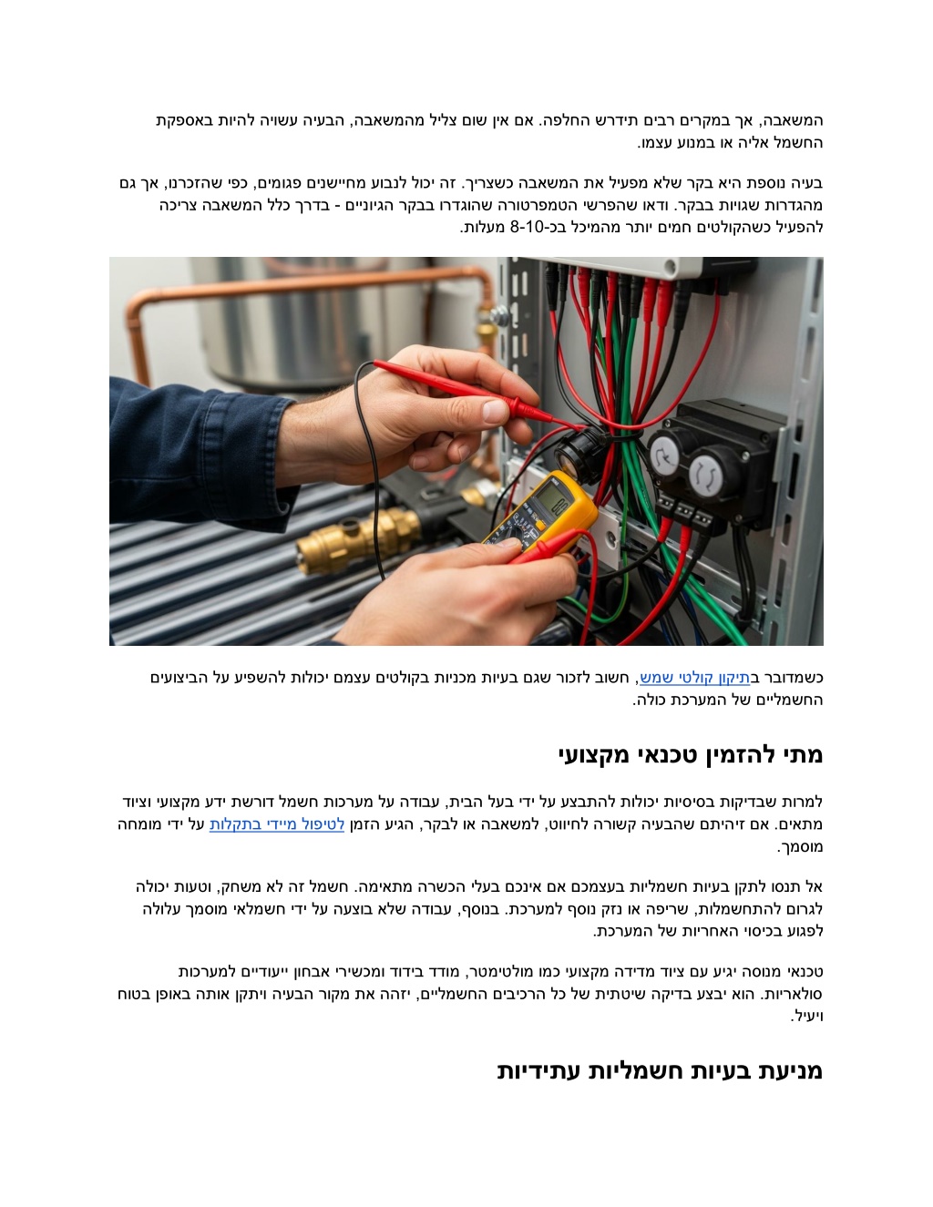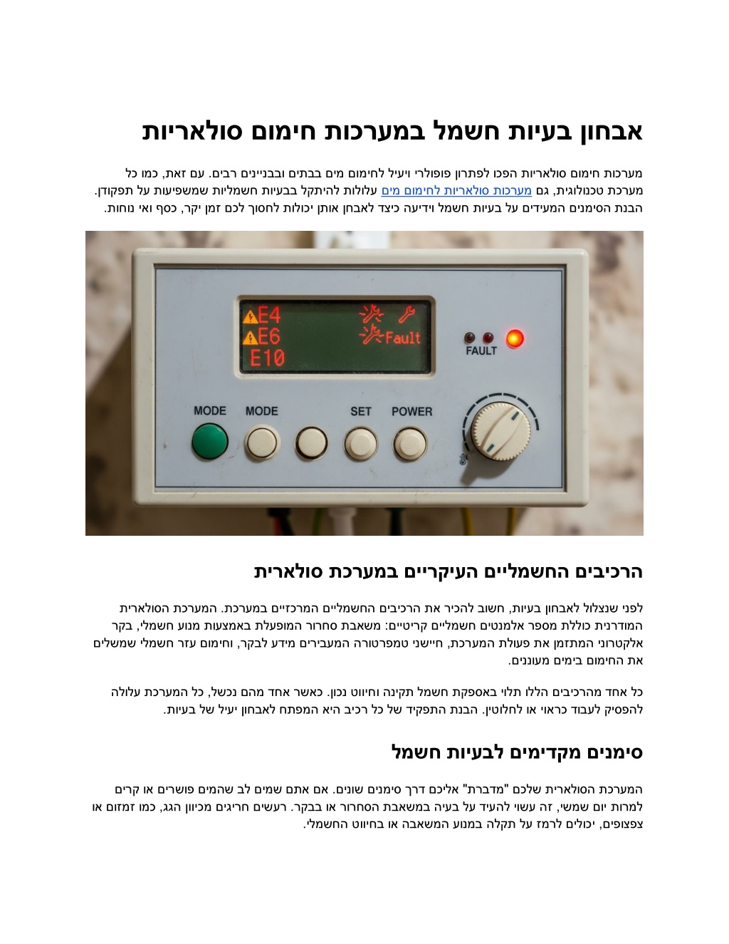 תקפסאב תויהל היושע היעבה ,הבאשמהמ לילצ םוש ןיא םא .הפלחה שרדית םיבר םירקמב ךא ,הבאשמה .ומצע עונמב וא הילא למשחה םג ךא ,ונרכזהש יפכ ,םימוגפ םינשייחמ עובנל לוכי הז .ךירצשכ הבאשמה תא ליעפמ אלש רקב איה תפסונ היעב רקבב ורדגוהש הרוטרפמטה ישרפהש ואדו .רקבב תויוגש תורדגהמ םיינויגה - הכירצ הבאשמה ללכ ךרדב .תולעמ 8-10 כב לכימהמ רתוי םימח םיטלוקהשכ ליעפהל - םיעוציבה לע עיפשהל תולוכי םמצע םיטלוקב תוינכמ תויעב םגש רוכזל בושח , שמש .הלוכ תכרעמה לש םיילמשחה יטלוק ןוקית ב רבודמשכ יעוצקמ יאנכט ןימז הל יתמ דויצו יעוצקמ עדי תשרוד למשח תוכרעמ לע הדובע ,תיבה לעב ידי לע עצבתהל תולוכי תויסיסב תוקידבש תורמל ןמזה עיגה ,רקבל וא הבאשמל ,טוויחל הרושק היעבהש םתיהיז םא .םיאתמ לופיטל ידיימ תולקתב החמומ ידי לע .ךמסומ הלוכי תועטו ,קחשמ אל הז למשח .המיאתמ הרשכה ילעב םכניא םא םכמצעב תוילמשח תויעב ןקתל וסנת לא הלולע ךמסומ יאלמשח ידי לע העצוב אלש הדובע ,ףסונב .תכרעמל ףסונ קזנ וא הפירש ,תולמשחתהל םורגל .תכרעמה לש תוירחאה יוסיכב עוגפל תוכרעמל םיידועיי ןוחבא ירישכמו דודיב דדומ ,רטמיטלומ ומכ יעוצקמ הדידמ דויצ םע עיגי הסונמ חוטב ןפואב התוא ןקתיו היעבה רוקמ תא ההזי ,םיילמשחה םיביכרה לכ לש תיתטיש הקידב עצבי אוה .תויראלוס יאנכט .ליעיו תוידיתע תוילמשח תויעב תעינמ