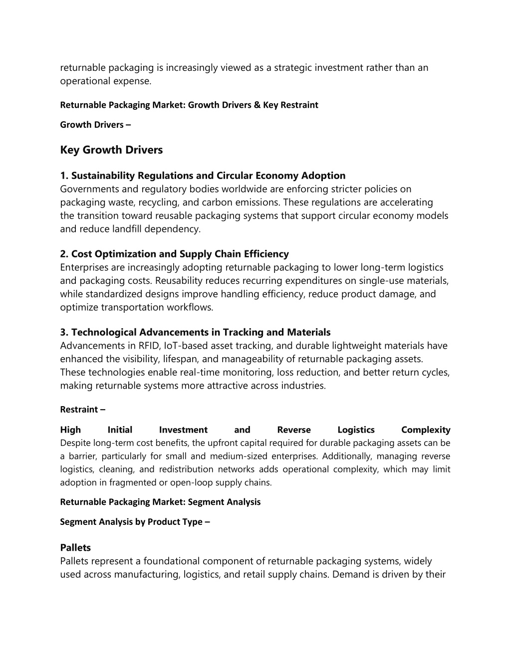 returnable packaging is increasingly viewed as a strategic investment rather than an operational expense. Returnable Packaging Market: Growth Drivers & Key Restraint Growth Drivers – Key Growth Drivers 1. Sustainability Regulations and Circular Economy Adoption Governments and regulatory bodies worldwide are enforcing stricter policies on packaging waste, recycling, and carbon emissions. These regulations are accelerating the transition toward reusable packaging systems that support circular economy models and reduce landfill dependency. 2. Cost Optimization and Supply Chain Efficiency Enterprises are increasingly adopting returnable packaging to lower long-term logistics and packaging costs. Reusability reduces recurring expenditures on single-use materials, while standardized designs improve handling efficiency, reduce product damage, and optimize transportation workflows. 3. Technological Advancements in Tracking and Materials Advancements in RFID, IoT-based asset tracking, and durable lightweight materials have enhanced the visibility, lifespan, and manageability of returnable packaging assets. These technologies enable real-time monitoring, loss reduction, and better return cycles, making returnable systems more attractive across industries. Restraint – High Despite long-term cost benefits, the upfront capital required for durable packaging assets can be a barrier, particularly for small and medium-sized enterprises. Additionally, managing reverse logistics, cleaning, and redistribution networks adds operational complexity, which may limit adoption in fragmented or open-loop supply chains. Initial Investment and Reverse Logistics Complexity Returnable Packaging Market: Segment Analysis Segment Analysis by Product Type – Pallets Pallets represent a foundational component of returnable packaging systems, widely used across manufacturing, logistics, and retail supply chains. Demand is driven by their