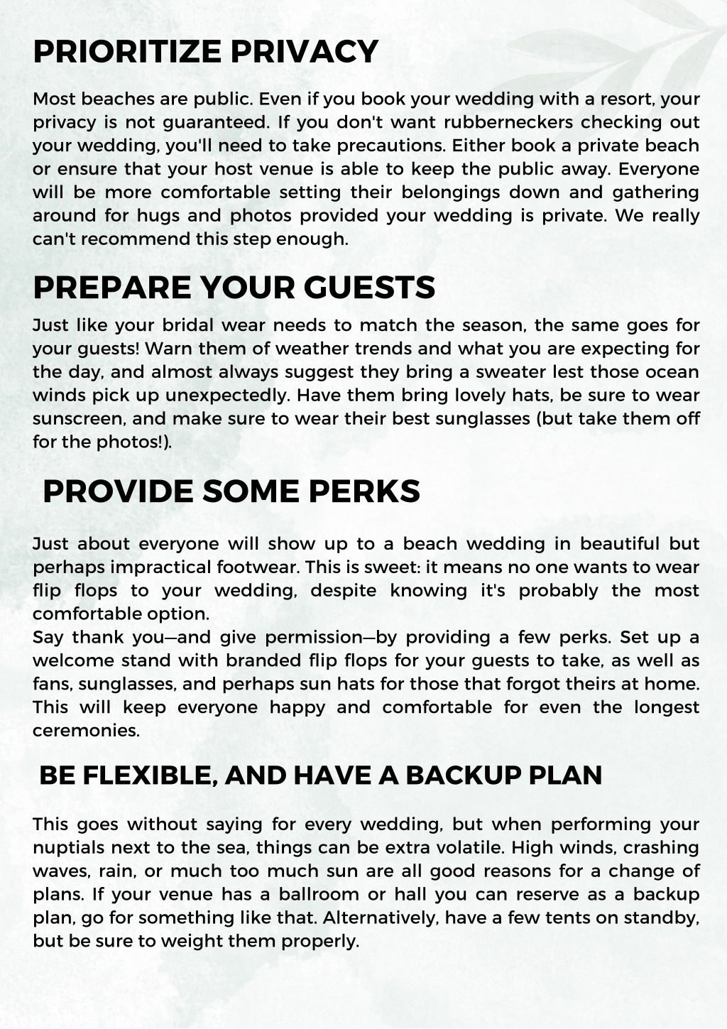 PRIORITIZE PRIVACY Most beaches are public. Even if you book your wedding with a resort, your privacy is not guaranteed. If you don't want rubberneckers checking out your wedding, you'll need to take precautions. Either book a private beach or ensure that your host venue is able to keep the public away. Everyone will be more comfortable setting their belongings down and gathering around for hugs and photos provided your wedding is private. We really can't recommend this step enough. PREPARE YOUR GUESTS Just like your bridal wear needs to match the season, the same goes for your guests! Warn them of weather trends and what you are expecting for the day, and almost always suggest they bring a sweater lest those ocean winds pick up unexpectedly. Have them bring lovely hats, be sure to wear sunscreen, and make sure to wear their best sunglasses (but take them off for the photos!). PROVIDE SOME PERKS Just about everyone will show up to a beach wedding in beautiful but perhaps impractical footwear. This is sweet: it means no one wants to wear flip flops to your wedding, despite knowing it's probably the most comfortable option. Say thank you—and give permission—by providing a few perks. Set up a welcome stand with branded flip flops for your guests to take, as well as fans, sunglasses, and perhaps sun hats for those that forgot theirs at home. This will keep everyone happy and comfortable for even the longest ceremonies. BE FLEXIBLE, AND HAVE A BACKUP PLAN This goes without saying for every wedding, but when performing your nuptials next to the sea, things can be extra volatile. High winds, crashing waves, rain, or much too much sun are all good reasons for a change of plans. If your venue has a ballroom or hall you can reserve as a backup plan, go for something like that. Alternatively, have a few tents on standby, but be sure to weight them properly.