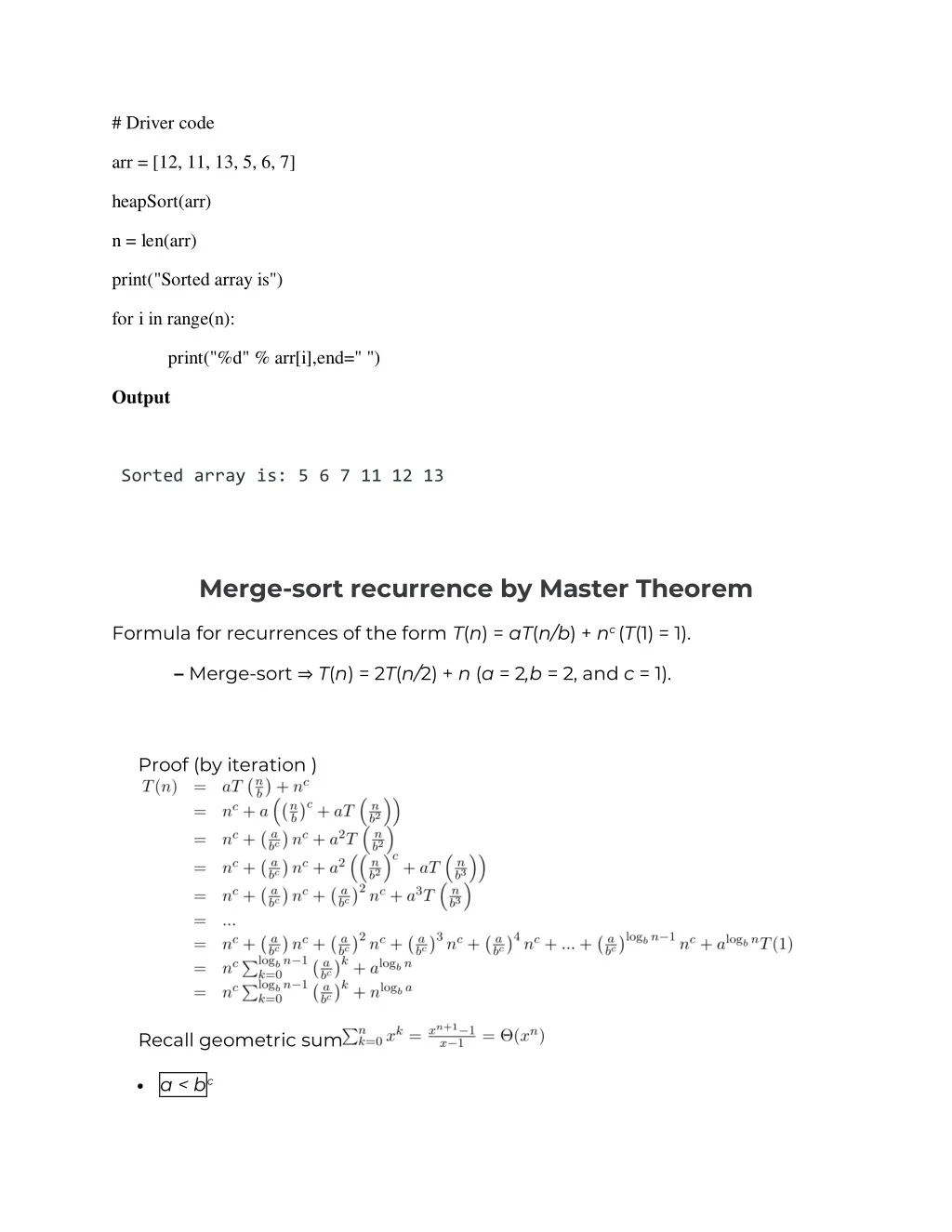 # Driver code arr = [12, 11, 13, 5, 6, 7] heapSort(arr) n = len(arr) print("Sorted array is") for i in range(n): print("%d" % arr[i],end=" ") Output Sorted array is: 5 6 7 11 12 13 Merge-sort recurrence by Master Theorem Formula for recurrences of the form T(n) = aT(n/b) + nc (T(1) = 1). –Merge-sort ⇒T(n) = 2T(n/2) + n (a = 2,b = 2, and c = 1). Proof (by iteration ) Recall geometric sum •a < bc