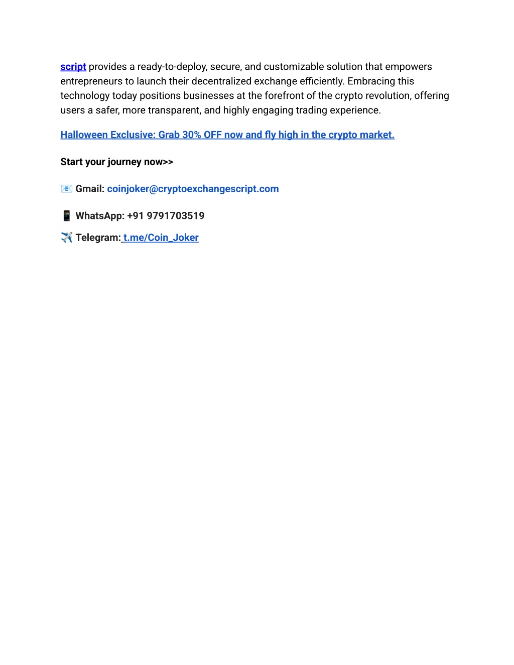 scriptprovides a ready-to-deploy, secure, and customizable solution that empowers entrepreneurs to launch their decentralized exchange efficiently. Embracing this technology today positions businesses at the forefront of the crypto revolution, offering users a safer, more transparent, and highly engaging trading experience. Halloween Exclusive: Grab 30% OFF now and fly high in the crypto market. Start your journey now>> ?Gmail:coinjoker@cryptoexchangescript.com ?WhatsApp:+91 9791703519 ✈Telegram:t.me/Coin_Joker