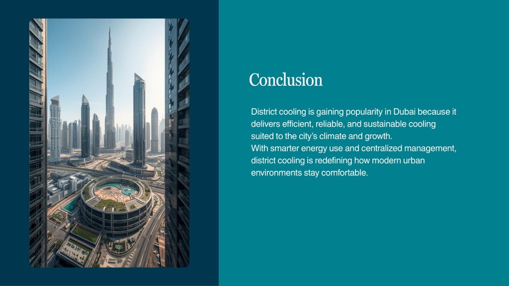 Why Can District Cooling Reduce Energy Consumption? Energy Efficiency Reduced Power Grid Pressure Improved Urban Energy Management District cooling systems significantly reduce energy consumption compared to traditional air-conditioning units, ensuring that multiple buildings share resources, leading to optimized usage and lower overall energy costs. By centralizing cooling efforts, district cooling alleviates the strain on Dubai's power grid, enhancing reliability and reducing the risk of outages during peak usage times across the city. District cooling facilitates better management of energy resources, allowing for efficient distribution and consumption, ultimately contributing to a sustainable urban environment and minimizing carbon emissions. 7