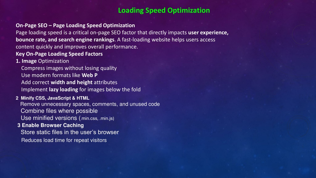 17. Loading Speed Optimization On-Page SEO – Page Loading Speed Optimization Page loading speed is a critical on-page SEO factor that directly impacts user experience, bounce rate, and search engine rankings. A fast-loading website helps users access content quickly and improves overall performance. Key On-Page Loading Speed Factors 1. Image Optimization Compress images without losing quality Use modern formats like Web P Add correct width and height attributes Implement lazy loading for images below the fold 2 Minify CSS, JavaScript & HTML • Remove unnecessary spaces, comments, and unused code • Combine files where possible • Use minified versions (.min.css, .min.js) • 3 Enable Browser Caching • Store static files in the user’s browser • Reduces load time for repeat visitors