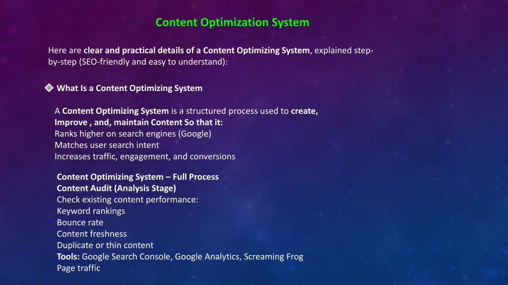 Content Optimization System Here are clear and practical details of a Content Optimizing System, explained step-by-step (SEO-friendly and easy to understand): 🔹 What Is a Content Optimizing System A Content Optimizing System is a structured process used to create, Improve , and, maintain Content So that it: Ranks higher on search engines (Google) Matches user search intent Increases traffic, engagement, and conversions Content Optimizing System – Full Process Content Audit (Analysis Stage) Check existing content performance: Keyword rankings Bounce rate Content freshness Duplicate or thin content Tools: Google Search Console, Google Analytics, Screaming Frog Page traffic