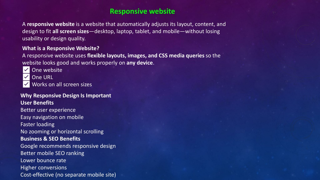 Responsive website A responsive website is a website that automatically adjusts its layout, content, and design to fit all screen sizes—desktop, laptop, tablet, and mobile—without losing usability or design quality. What is a Responsive Website? A responsive website uses flexible layouts, images, and CSS media queries so the website looks good and works properly on any device. ✅ One website ✅ One URL ✅ Works on all screen sizes Why Responsive Design Is Important User Benefits Better user experience Easy navigation on mobile Faster loading No zooming or horizontal scrolling Business & SEO Benefits Google recommends responsive design Better mobile SEO ranking Lower bounce rate Higher conversions Cost-effective (no separate mobile site)