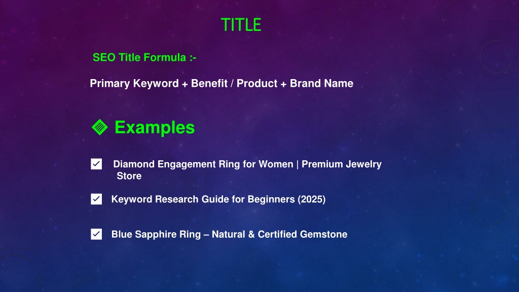 Title SEO Title Formula :- Primary Keyword + Benefit / Product + Brand Name • 🔹 Examples • ✅Diamond Engagement Ring for Women | Premium Jewelry • Store • ✅ Keyword Research Guide for Beginners (2025) • ✅ Blue Sapphire Ring – Natural & Certified Gemstone