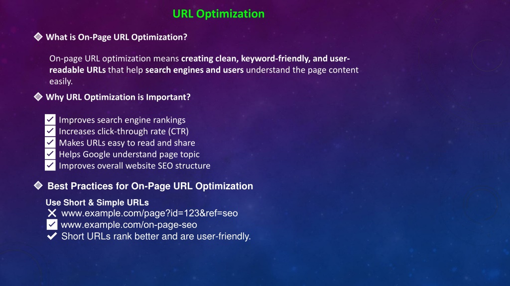 URL Optimization 🔹 What is On-Page URL Optimization? On-page URL optimization means creating clean, keyword-friendly, and user-readable URLs that help search engines and users understand the page content easily. 🔹 Why URL Optimization is Important? ✅ Improves search engine rankings ✅ Increases click-through rate (CTR) ✅ Makes URLs easy to read and share ✅ Helps Google understand page topic ✅ Improves overall website SEO structure 🔹 Best Practices for On-Page URL Optimization Use Short & Simple URLs ❌ www.example.com/page?id=123&ref=seo✅ www.example.com/on-page-seo ✔ Short URLs rank better and are user-friendly.