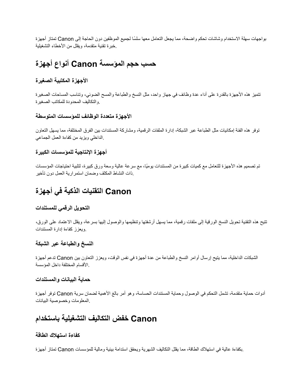 ةزﮭﺟأ ﺔﯾﻠﯾﻐﺷﺗﻟا زﺎﺗﻣﺗ Canon ءﺎطﺧﻷا ،ﺔﺣﺿاو ﺎﻣﻣ لﻌﺟﯾ لﻣﺎﻌﺗﻟا ﺎﮭﻌﻣ ﺎًﺳﻠﺳ ﻊﯾﻣﺟﻟ نﯾﻔظوﻣﻟا نود ﺔﺟﺎﺣﻟا ﻰﻟإ ةرﺑﺧ ﺔﯾﻧﻘﺗ ،ﺔﻣدﻘﺗﻣ لﻠﻘﯾو نﻣ . مﻛﺣﺗ تﺎﺷﺎﺷو مادﺧﺗﺳﻻا تﺎﮭﺟاوﺑ ﺔﻠﮭﺳ ةزﮭﺟأ عاوﻧأ Canon ﺔﺳﺳؤﻣﻟا مﺟﺣ بﺳﺣ ةرﯾﻐﺻﻟا ﺔﯾﺑﺗﻛﻣﻟا ةزﮭﺟﻷا فﺋﺎظو ﻲﻓ زﺎﮭﺟ ،دﺣاو لﺛﻣ ﺦﺳﻧﻟا ﺔﻋﺎﺑطﻟاو ﺢﺳﻣﻟاو ،ﻲﺋوﺿﻟا بﺳﺎﻧﺗو تﺎﺣﺎﺳﻣﻟا ةرﯾﻐﺻﻟا فﯾﻟﺎﻛﺗﻟاو ةدودﺣﻣﻟا بﺗﺎﻛﻣﻠﻟ ةرﯾﻐﺻﻟا . ةدﻋ ءادأ ﻰﻠﻋ ةردﻘﻟﺎﺑ ةزﮭﺟﻷا هذھ زﯾﻣﺗﺗ ﺔطﺳوﺗﻣﻟا تﺎﺳﺳؤﻣﻠﻟ فﺋﺎظوﻟا ةددﻌﺗﻣ ةزﮭﺟﻷا تادﻧﺗﺳﻣﻟا نﯾﺑ قرﻔﻟا ،ﺔﻔﻠﺗﺧﻣﻟا ﺎﻣﻣ لﮭﺳﯾ نوﺎﻌﺗﻟا نﻣ ةءﺎﻔﻛ لﻣﻌﻟا ﻲﻋﺎﻣﺟﻟا ﺔﻛرﺎﺷﻣو ،ﺔﯾﻣﻗرﻟا تﺎﻔﻠﻣﻟا ةرادإ ،ﺔﻛﺑﺷﻟا ﺔﻋﺎﺑطﻟا رﺑﻋ تﺎﯾﻧﺎﻛﻣإ لﺛﻣ ﺔﺋﻔﻟا هذھ رﻓوﺗ دﯾزﯾو ﻲﻠﺧادﻟا . ةرﯾﺑﻛﻟا تﺎﺳﺳؤﻣﻠﻟ ﺔﯾﺟﺎﺗﻧﻹا ةزﮭﺟأ تﺎﺳﺳؤﻣﻟا ﺔﯾﺑﻠﺗﻟ ﺔﯾرارﻣﺗﺳا لﻣﻌﻟا نود رﯾﺧﺄﺗ تﺎﺟﺎﯾﺗﺣا ،ةرﯾﺑﻛ نﺎﻣﺿو قرو ﺔﻌﺳو فﺛﻛﻣﻟا ﺔﯾﻟﺎﻋ طﺎﺷﻧﻟا ﺔﻋرﺳ تاذ ،ﺎًﯾﻣوﯾ ﻊﻣ تادﻧﺗﺳﻣﻟا ةرﯾﺑﻛ نﻣ تﺎﯾﻣﻛ لﻣﺎﻌﺗﻠﻟ ﻊﻣ ةزﮭﺟﻷا مﯾﻣﺻﺗ هذھ مﺗ . ةزﮭﺟأ ﺔﯾﻛذﻟا ﻲﻓ تﺎﯾﻧﻘﺗﻟا Canon تادﻧﺗﺳﻣﻠﻟ ﻲﻣﻗرﻟا لﯾوﺣﺗﻟا ﺔﯾﻗروﻟا ﻰﻟإ تﺎﻔﻠﻣ ،ﺔﯾﻣﻗر ﺎﻣﻣ لﮭﺳﯾ ﺎﮭﺗﻔﺷرأ ﺎﮭﻣﯾظﻧﺗو لوﺻوﻟاو ﺎﮭﯾﻟإ ،ﺔﻋرﺳﺑ لﻠﻘﯾو دﺎﻣﺗﻋﻻا ﻰﻠﻋ ،قروﻟا ززﻌﯾو ةءﺎﻔﻛ ةرادإ تادﻧﺗﺳﻣﻟا . ﺦﺳﻧﻟا لﯾوﺣﺗ ﺔﯾﻧﻘﺗﻟا هذھ ﺢﯾﺗﺗ ﺔﻋﺎﺑطﻟاو رﺑﻋ ﺔﻛﺑﺷﻟا ﺦﺳﻧﻟا ةزﮭﺟأ ﺔﺳﺳؤﻣﻟا مﻋدﺗ Canon ﺔﻔﻠﺗﺧﻣﻟا لﺧاد ،ﺔﯾﻠﺧادﻟا ﺎﻣﻣ ﺢﯾﺗﯾ لﺎﺳرإ رﻣاوأ ﺦﺳﻧﻟا ﺔﻋﺎﺑطﻟاو نﻣ ةدﻋ ةزﮭﺟأ ﻲﻓ سﻔﻧ ،تﻗوﻟا ززﻌﯾو نوﺎﻌﺗﻟا نﯾﺑ مﺎﺳﻗﻷا . تﺎﻛﺑﺷﻟا تادﻧﺗﺳﻣﻟاو تﺎﻧﺎﯾﺑﻟا ﺔﯾﺎﻣﺣ رﻓوﺗ ﺔﯾﺻوﺻﺧو تﺎﻧﺎﯾﺑﻟا ةزﮭﺟأ Canon ،ﺔﺳﺎﺳﺣﻟا وھو رﻣأ ﻎﻟﺎﺑ ﺔﯾﻣھﻷا نﺎﻣﺿﻟ ﺔﯾرﺳ تﺎﻣوﻠﻌﻣﻟا . تادﻧﺗﺳﻣﻟا ﺔﯾﺎﻣﺣو لوﺻوﻟا مﻛﺣﺗﻟا ﻲﻓ لﻣﺷﺗ ،ﺔﻣدﻘﺗﻣ ﺔﯾﺎﻣﺣ تاودأ مادﺧﺗﺳﺎﺑ ﺔﯾﻠﯾﻐﺷﺗﻟا فﯾﻟﺎﻛﺗﻟا ضﻔﺧ Canon ﺔﻗﺎطﻟا كﻼﮭﺗﺳا ةءﺎﻔﻛ ةزﮭﺟأ زﺎﺗﻣﺗ Canon ،ﺔﻗﺎطﻟا ﺎﻣﻣ لﻠﻘﯾ فﯾﻟﺎﻛﺗﻟا ﺔﯾرﮭﺷﻟا قﻘﺣﯾو ﺔﻣادﺗﺳا ﺔﯾﺋﯾﺑ ﺔﯾﻟﺎﻣو تﺎﺳﺳؤﻣﻠﻟ كﻼﮭﺗﺳا ﺔﯾﻟﺎﻋ ﻲﻓ ةءﺎﻔﻛﺑ .