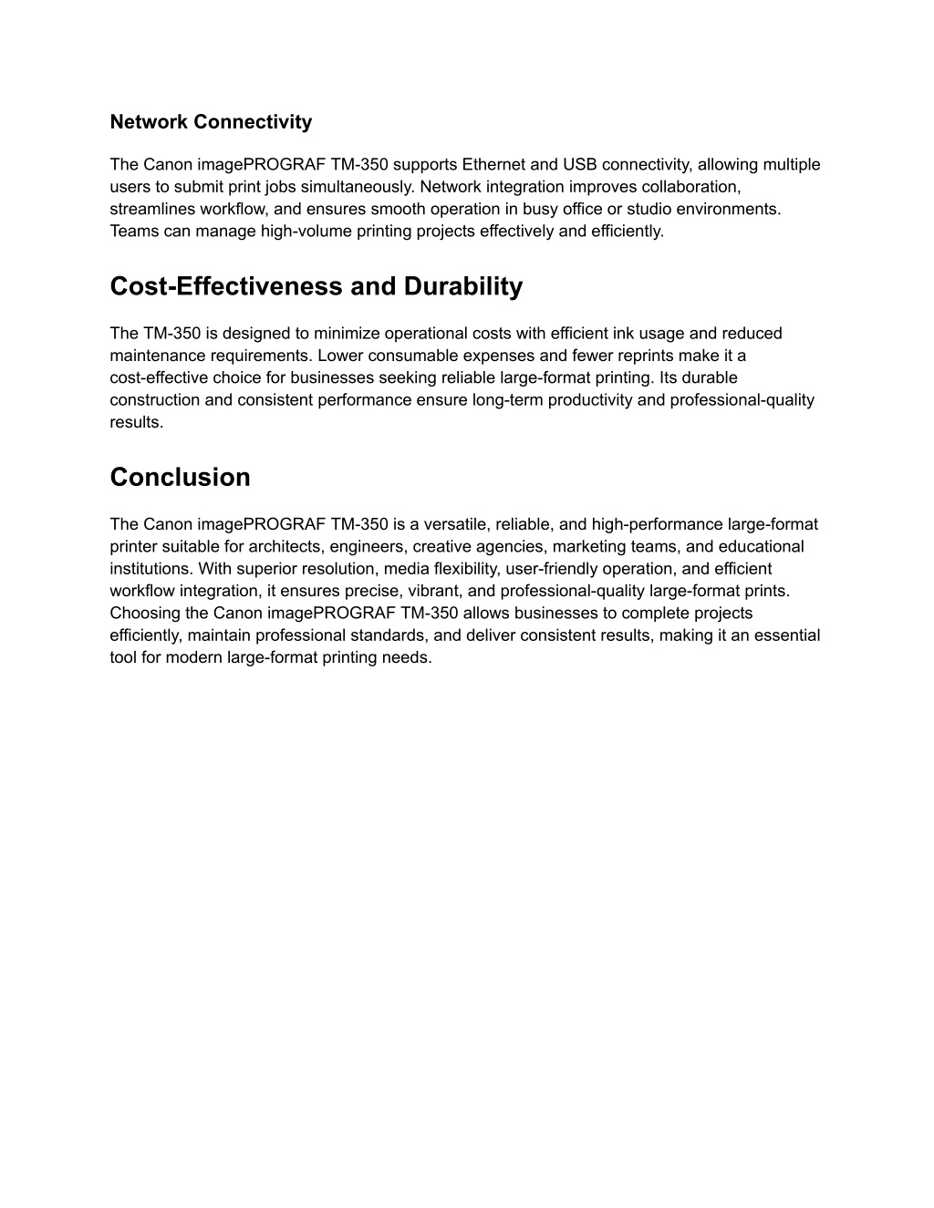 Network Connectivity The Canon imagePROGRAF TM-350 supports Ethernet and USB connectivity, allowing multiple users to submit print jobs simultaneously. Network integration improves collaboration, streamlines workflow, and ensures smooth operation in busy office or studio environments. Teams can manage high-volume printing projects effectively and efficiently. Cost-Effectiveness and Durability The TM-350 is designed to minimize operational costs with efficient ink usage and reduced maintenance requirements. Lower consumable expenses and fewer reprints make it a cost-effective choice for businesses seeking reliable large-format printing. Its durable construction and consistent performance ensure long-term productivity and professional-quality results. Conclusion The Canon imagePROGRAF TM-350 is a versatile, reliable, and high-performance large-format printer suitable for architects, engineers, creative agencies, marketing teams, and educational institutions. With superior resolution, media flexibility, user-friendly operation, and efficient workflow integration, it ensures precise, vibrant, and professional-quality large-format prints. Choosing the Canon imagePROGRAF TM-350 allows businesses to complete projects efficiently, maintain professional standards, and deliver consistent results, making it an essential tool for modern large-format printing needs.