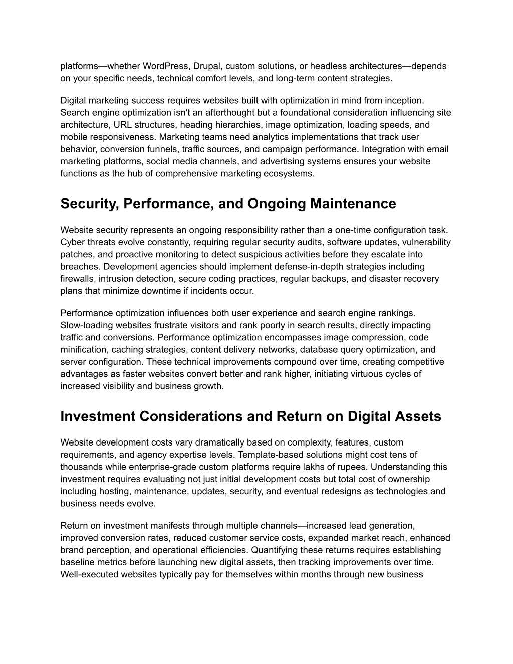 5. platforms—whether WordPress, Drupal, custom solutions, or headless architectures—depends on your specific needs, technical comfort levels, and long-term content strategies. Digital marketing success requires websites built with optimization in mind from inception. Search engine optimization isn't an afterthought but a foundational consideration influencing site architecture, URL structures, heading hierarchies, image optimization, loading speeds, and mobile responsiveness. Marketing teams need analytics implementations that track user behavior, conversion funnels, traffic sources, and campaign performance. Integration with email marketing platforms, social media channels, and advertising systems ensures your website functions as the hub of comprehensive marketing ecosystems. Security, Performance, and Ongoing Maintenance Website security represents an ongoing responsibility rather than a one-time configuration task. Cyber threats evolve constantly, requiring regular security audits, software updates, vulnerability patches, and proactive monitoring to detect suspicious activities before they escalate into breaches. Development agencies should implement defense-in-depth strategies including firewalls, intrusion detection, secure coding practices, regular backups, and disaster recovery plans that minimize downtime if incidents occur. Performance optimization influences both user experience and search engine rankings. Slow-loading websites frustrate visitors and rank poorly in search results, directly impacting traffic and conversions. Performance optimization encompasses image compression, code minification, caching strategies, content delivery networks, database query optimization, and server configuration. These technical improvements compound over time, creating competitive advantages as faster websites convert better and rank higher, initiating virtuous cycles of increased visibility and business growth. Investment Considerations and Return on Digital Assets Website development costs vary dramatically based on complexity, features, custom requirements, and agency expertise levels. Template-based solutions might cost tens of thousands while enterprise-grade custom platforms require lakhs of rupees. Understanding this investment requires evaluating not just initial development costs but total cost of ownership including hosting, maintenance, updates, security, and eventual redesigns as technologies and business needs evolve. Return on investment manifests through multiple channels—increased lead generation, improved conversion rates, reduced customer service costs, expanded market reach, enhanced brand perception, and operational efficiencies. Quantifying these returns requires establishing baseline metrics before launching new digital assets, then tracking improvements over time. Well-executed websites typically pay for themselves within months through new business