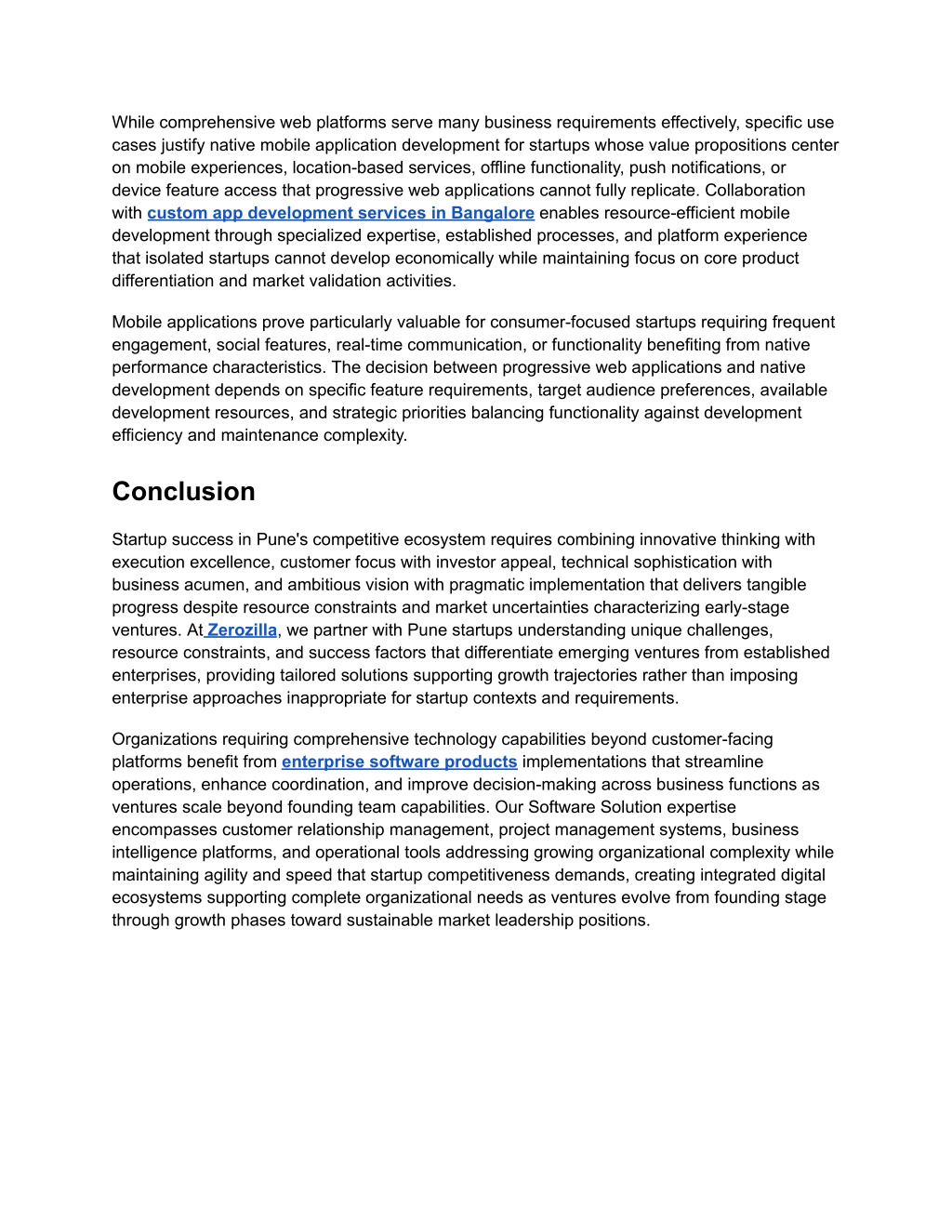 6. While comprehensive web platforms serve many business requirements effectively, specific use cases justify native mobile application development for startups whose value propositions center on mobile experiences, location-based services, offline functionality, push notifications, or device feature access that progressive web applications cannot fully replicate. Collaboration with custom app development services in Bangalore enables resource-efficient mobile development through specialized expertise, established processes, and platform experience that isolated startups cannot develop economically while maintaining focus on core product differentiation and market validation activities. Mobile applications prove particularly valuable for consumer-focused startups requiring frequent engagement, social features, real-time communication, or functionality benefiting from native performance characteristics. The decision between progressive web applications and native development depends on specific feature requirements, target audience preferences, available development resources, and strategic priorities balancing functionality against development efficiency and maintenance complexity. Conclusion Startup success in Pune's competitive ecosystem requires combining innovative thinking with execution excellence, customer focus with investor appeal, technical sophistication with business acumen, and ambitious vision with pragmatic implementation that delivers tangible progress despite resource constraints and market uncertainties characterizing early-stage ventures. At Zerozilla, we partner with Pune startups understanding unique challenges, resource constraints, and success factors that differentiate emerging ventures from established enterprises, providing tailored solutions supporting growth trajectories rather than imposing enterprise approaches inappropriate for startup contexts and requirements. Organizations requiring comprehensive technology capabilities beyond customer-facing platforms benefit from enterprise software products implementations that streamline operations, enhance coordination, and improve decision-making across business functions as ventures scale beyond founding team capabilities. Our Software Solution expertise encompasses customer relationship management, project management systems, business intelligence platforms, and operational tools addressing growing organizational complexity while maintaining agility and speed that startup competitiveness demands, creating integrated digital ecosystems supporting complete organizational needs as ventures evolve from founding stage through growth phases toward sustainable market leadership positions.
