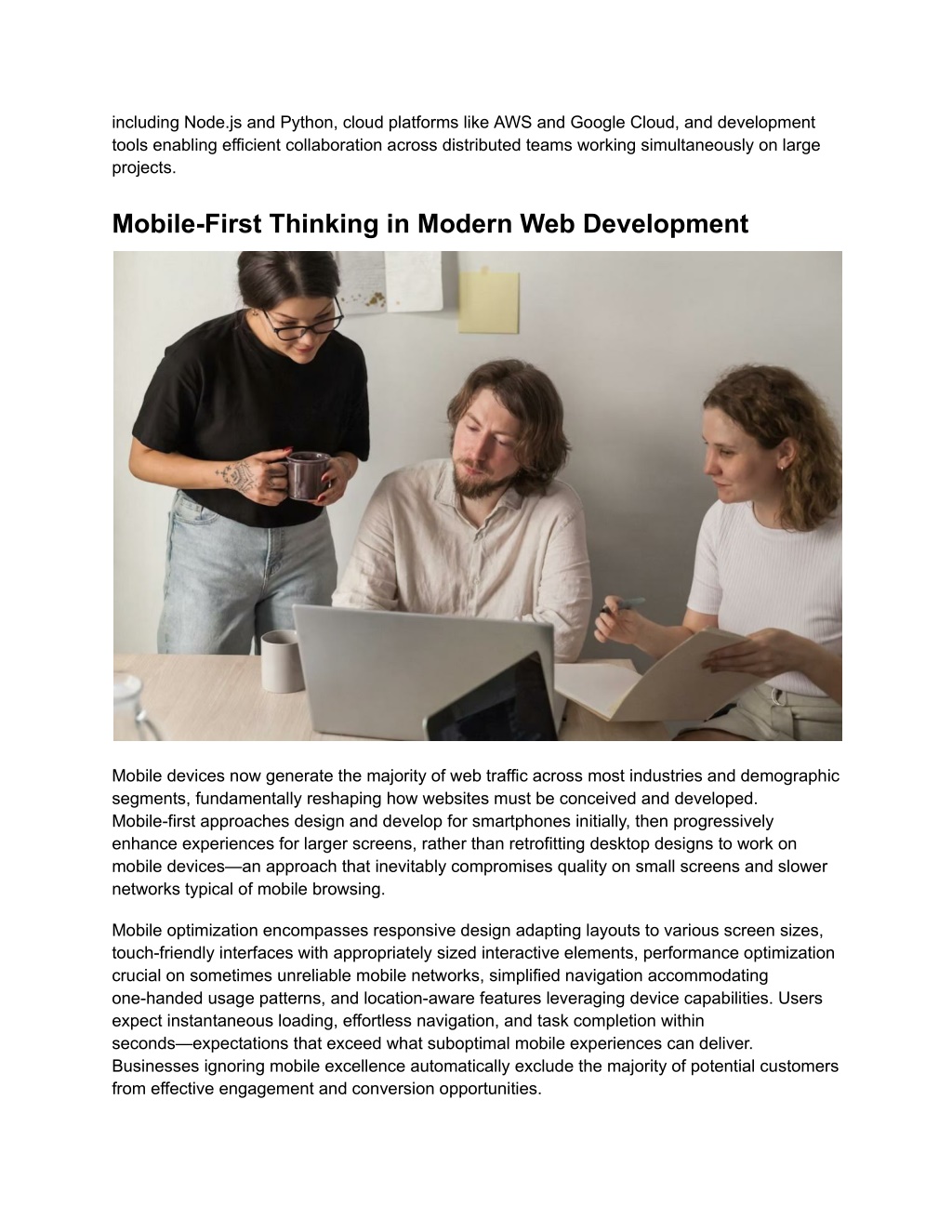 including Node.js and Python, cloud platforms like AWS and Google Cloud, and development tools enabling efficient collaboration across distributed teams working simultaneously on large projects. Mobile-First Thinking in Modern Web Development Mobile devices now generate the majority of web traffic across most industries and demographic segments, fundamentally reshaping how websites must be conceived and developed. Mobile-first approaches design and develop for smartphones initially, then progressively enhance experiences for larger screens, rather than retrofitting desktop designs to work on mobile devices—an approach that inevitably compromises quality on small screens and slower networks typical of mobile browsing. Mobile optimization encompasses responsive design adapting layouts to various screen sizes, touch-friendly interfaces with appropriately sized interactive elements, performance optimization crucial on sometimes unreliable mobile networks, simplified navigation accommodating one-handed usage patterns, and location-aware features leveraging device capabilities. Users expect instantaneous loading, effortless navigation, and task completion within seconds—expectations that exceed what suboptimal mobile experiences can deliver. Businesses ignoring mobile excellence automatically exclude the majority of potential customers from effective engagement and conversion opportunities.