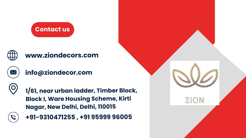 Contact us www.ziondecors.com info@ziondecor.com 1/61, near urban ladder, Timber Block, Block I, Ware Housing Scheme, Kirti Nagar, New Delhi, Delhi, 110015 +91-9310471255 , +91 95999 96005