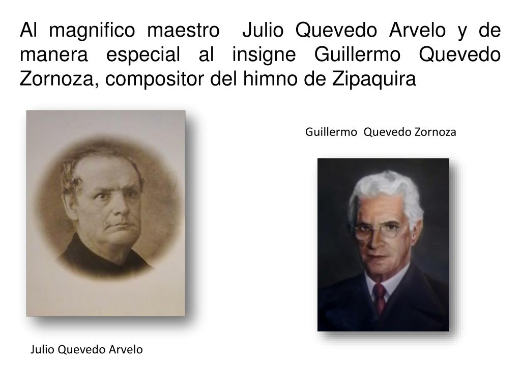 Al magnifico maestro Julio Quevedo Arvelo y de manera especial al insigne Guillermo Quevedo Zornoza, compositor del himno de Zipaquira Guillermo Quevedo Zornoza Julio Quevedo Arvelo