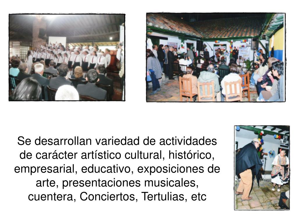 Se desarrollan variedad de actividades de carácter artístico cultural, histórico, empresarial, educativo, exposiciones de arte, presentaciones musicales, cuentera, Conciertos, Tertulias, etc