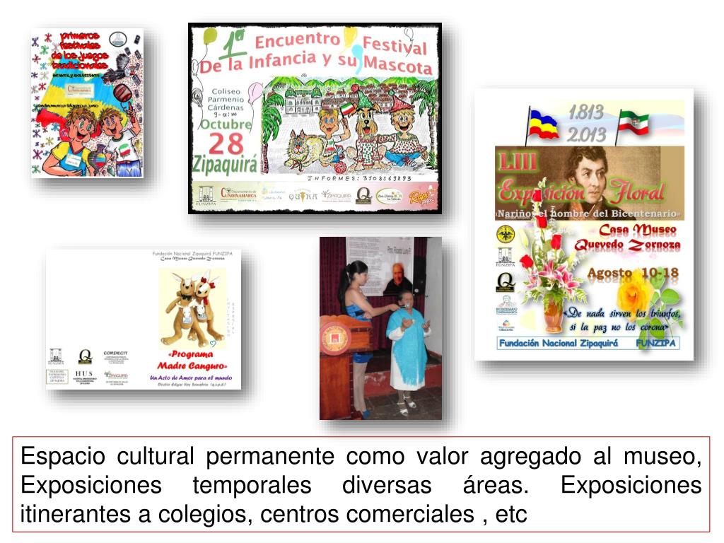 Espacio cultural permanente como valor agregado al museo, Exposiciones temporales diversas áreas. Exposiciones itinerantes a colegios, centros comerciales , etc