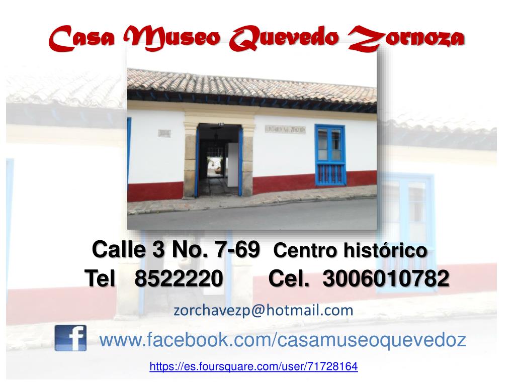 Casa Museo Quevedo Zornoza Calle 3 No. 7-69 Centro histórico Tel 8522220 Cel. 3006010782 zorchavezp@hotmail.com www.facebook.com/casamuseoquevedoz www.facebook.com/casamuseoquevedoz https://es.foursquare.com/user/71728164