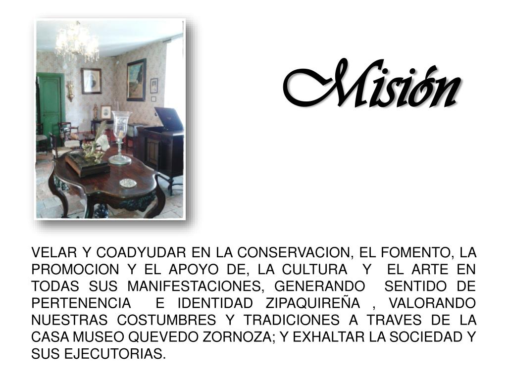 Misión VELAR Y COADYUDAR EN LA CONSERVACION, EL FOMENTO, LA PROMOCION Y EL APOYO DE, LA CULTURA Y EL ARTE EN TODAS SUS MANIFESTACIONES, GENERANDO SENTIDO DE PERTENENCIA E IDENTIDAD ZIPAQUIREÑA , VALORANDO NUESTRAS COSTUMBRES Y TRADICIONES A TRAVES DE LA CASA MUSEO QUEVEDO ZORNOZA; Y EXHALTAR LA SOCIEDAD Y SUS EJECUTORIAS.