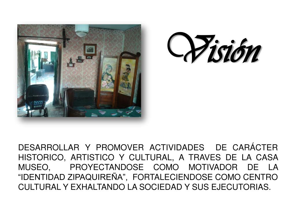 Visión DESARROLLAR Y PROMOVER ACTIVIDADES DE CARÁCTER HISTORICO, ARTISTICO Y CULTURAL, A TRAVES DE LA CASA MUSEO, PROYECTANDOSE COMO MOTIVADOR DE LA “IDENTIDAD ZIPAQUIREÑA”, FORTALECIENDOSE COMO CENTRO CULTURAL Y EXHALTANDO LA SOCIEDAD Y SUS EJECUTORIAS.