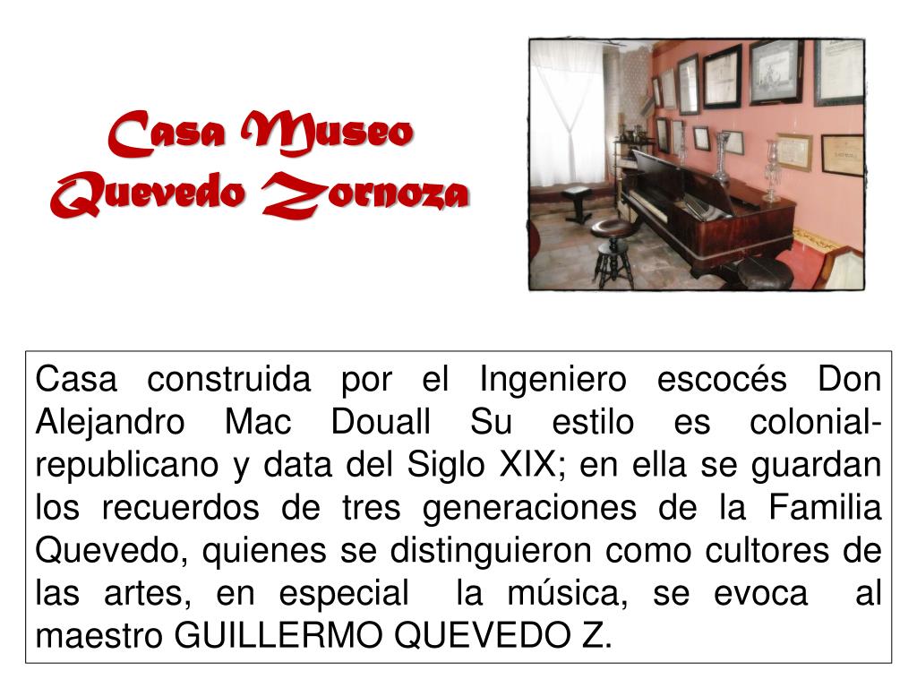 Casa Museo Quevedo Zornoza Casa construida por el Ingeniero escocés Don Alejandro Mac Douall Su estilo es colonial-republicano y data del Siglo XIX; en ella se guardan los recuerdos de tres generaciones de la Familia Quevedo, quienes se distinguieron como cultores de las artes, en especial la música, se evoca al maestro GUILLERMO QUEVEDO Z.