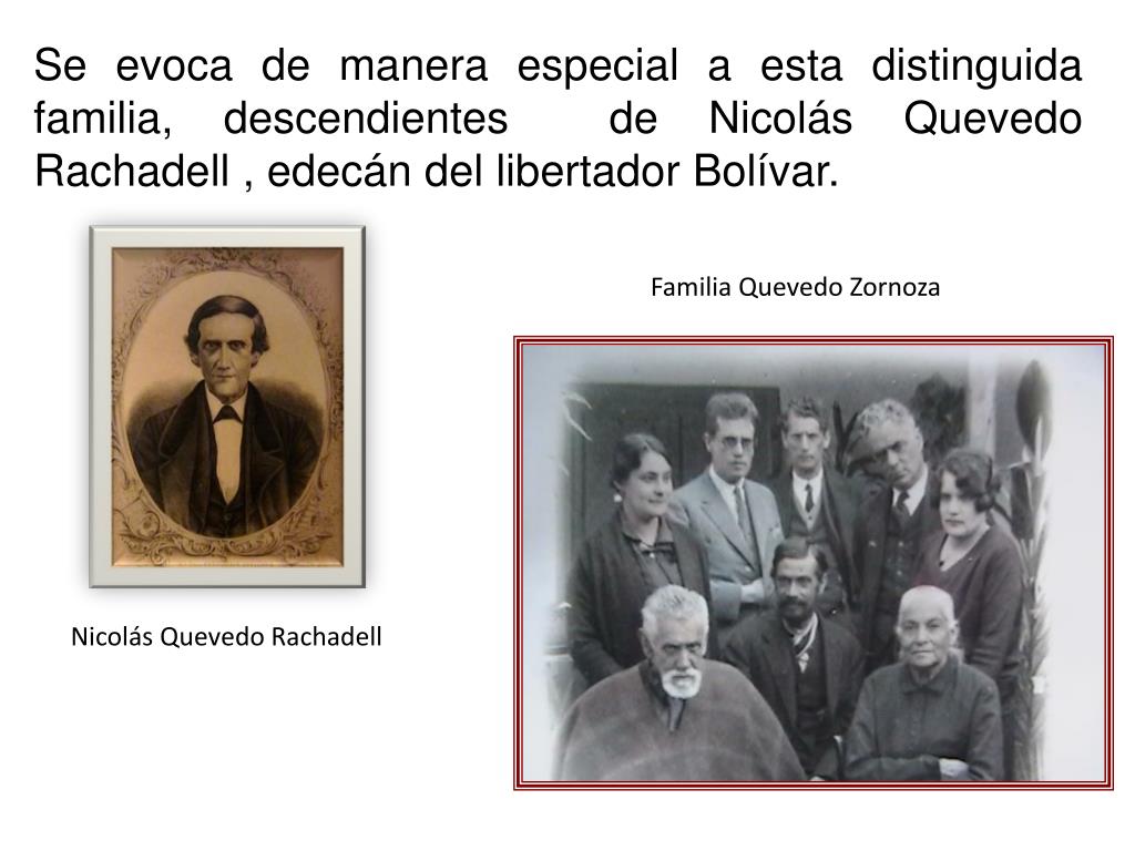 Se evoca de manera especial a esta distinguida familia, descendientes de Nicolás Quevedo Rachadell , edecán del libertador Bolívar. Familia Quevedo Zornoza Nicolás Quevedo Rachadell