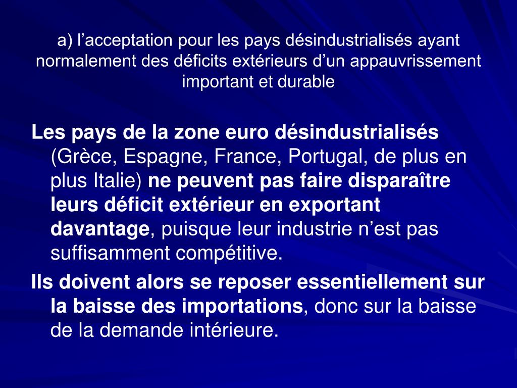 a) l’acceptation pour les pays désindustrialisés ayant normalement des déficits extérieurs d’un appauvrissement important et durable Les pays de la zone euro désindustrialisés (Grèce, Espagne, France, Portugal, de plus en plus Italie) ne peuvent pas faire disparaître leurs déficit extérieur en exportant davantage, puisque leur industrie n’est pas suffisamment compétitive. Ils doivent alors se reposer essentiellement sur la baisse des importations, donc sur la baisse de la demande intérieure.