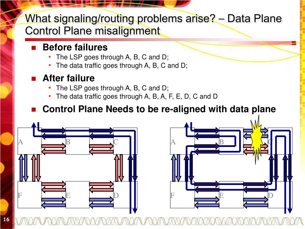 A B C A B C F E D F E D What signaling/routing problems arise? – Data Plane Control Plane misalignment • Before failures • The LSP goes through A, B, C and D; • The data traffic goes through A, B, C and D; • After failure • The LSP goes through A, B, C and D; • The data traffic goes through A, B, A, F, E, D, C and D • Control Plane Needs to be re-aligned with data plane