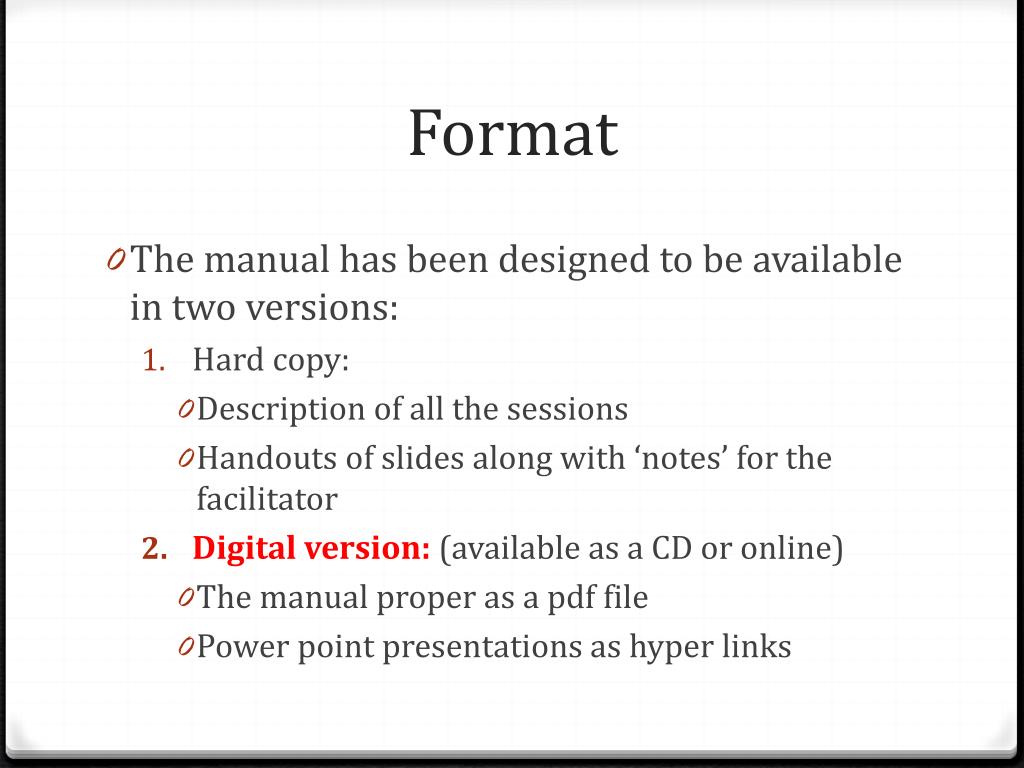 Format • The manual has been designed to be available in two versions: • Hard copy: • Description of all the sessions • Handouts of slides along with ‘notes’ for the facilitator