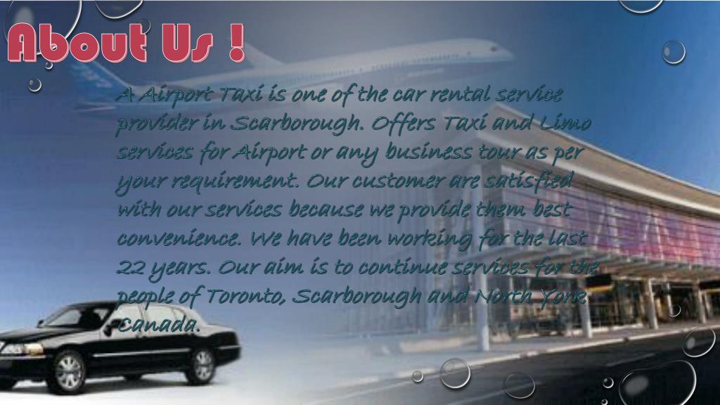 A Airport Taxi is one of the car rental service provider in Scarborough. Offers Taxi and Limo services for Airport or any business tour as per your requirement.