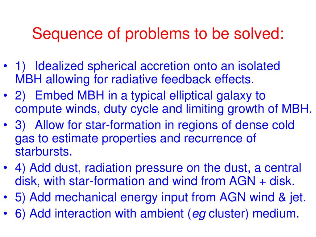 Sequence of problems to be solved: • 1) Idealized spherical accretion onto an isolated MBH allowing for radiative feedback effects. • 2) Embed MBH in a typical elliptical galaxy to compute winds, duty cycle and limiting growth of MBH. • 3) Allow for star-formation in regions of dense cold gas to estimate properties and recurrence of starbursts. • 4) Add dust, radiation pressure on the dust, a central disk, with star-formation and wind from AGN + disk. • 5) Add mechanical energy input from AGN wind & jet. • 6) Add interaction with ambient (eg cluster) medium.