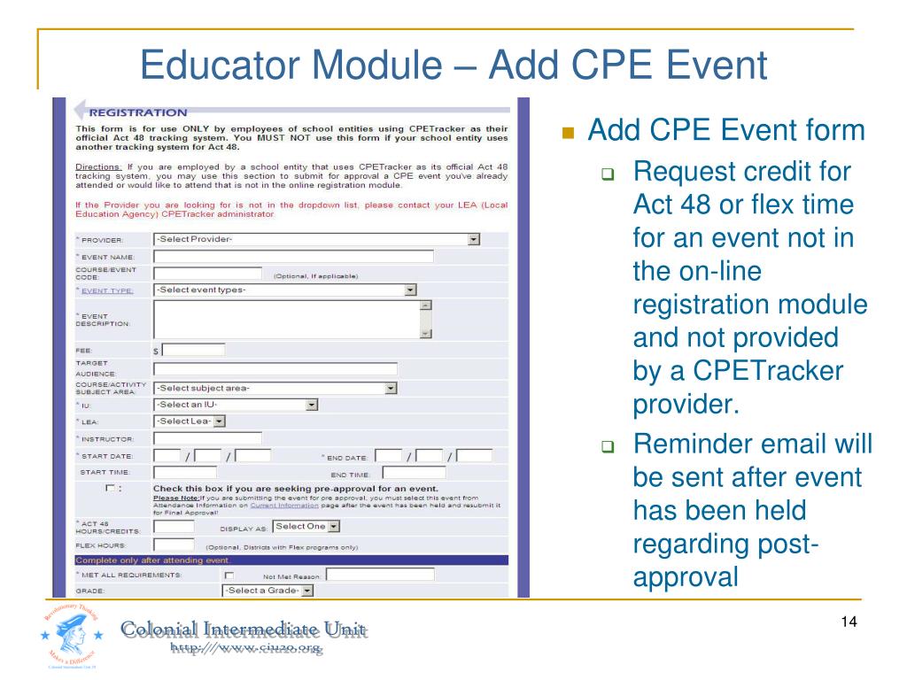Educator Module – Add CPE Event • Add CPE Event form • Request credit for Act 48 or flex time for an event not in the on-line registration module and not provided by a CPETracker provider. • Reminder email will be sent after event has been held regarding post-approval