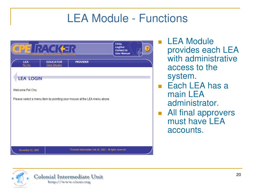 LEA Module - Functions • LEA Module provides each LEA with administrative access to the system. • Each LEA has a main LEA administrator. • All final approvers must have LEA accounts.