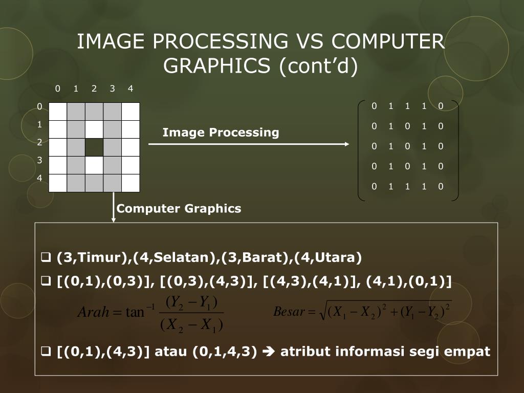 0 1 2 3 4 0 1 2 3 4 0 1 1 1 0 0 1 0 1 0 0 1 0 1 0 0 1 0 1 0 0 1 1 1 0 IMAGE PROCESSING VS COMPUTER GRAPHICS (cont’d) Image Processing Computer Graphics • (3,Timur),(4,Selatan),(3,Barat),(4,Utara) • [(0,1),(0,3)], [(0,3),(4,3)], [(4,3),(4,1)], (4,1),(0,1)] • [(0,1),(4,3)] atau (0,1,4,3) atributinformasisegiempat
