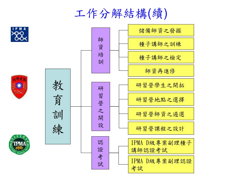 工作分解結構(續) 儲備師資之發掘 師 資 培 訓 種子講師之訓練 種子講師之檢定 師資再進修 教 育 訓 練 研習營學生之開拓 研 習 營 之 開 設 研習營地點之選擇 研習營師資之遴選 研習營課程之設計 認 證 考 試 IPMA D級專案副理種子 講師認證考試 IPMA D級專案副理認證 考試