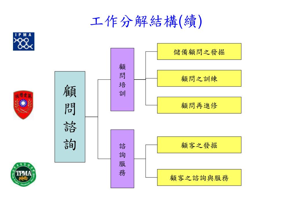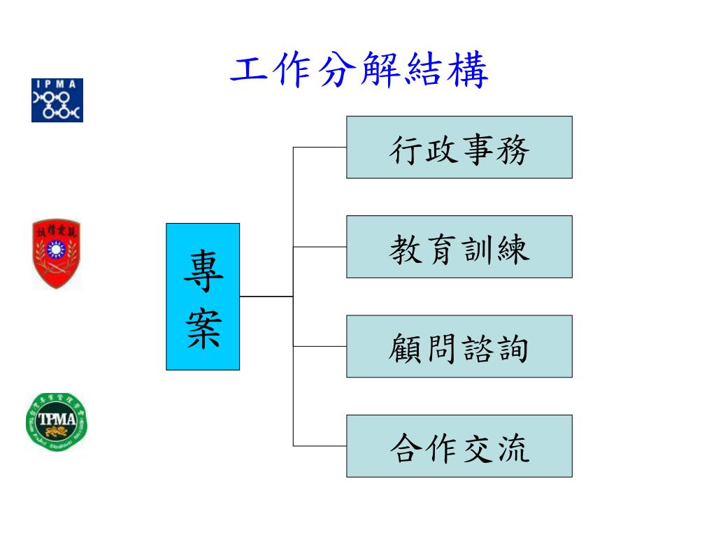 工作分解結構 行政事務 教育訓練 專 案 顧問諮詢 合作交流