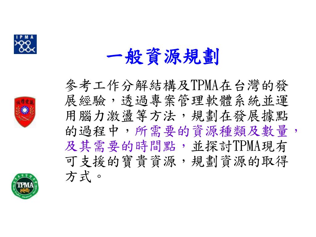 一般資源規劃 參考工作分解結構及TPMA在台灣的發展經驗,透過專案管理軟體系統並運用腦力激盪等方法,規劃在發展據點的過程中,所需要的資源種類及數量,及其需要的時間點,並探討TPMA現有可支援的寶貴資源,規劃資源的取得方式。