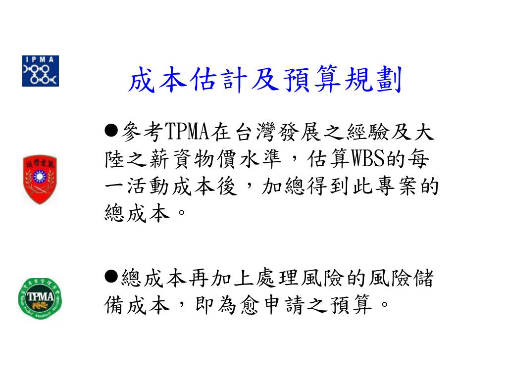 成本估計及預算規劃 參考TPMA在台灣發展之經驗及大陸之薪資物價水準,估算WBS的每一活動成本後,加總得到此專案的總成本。 總成本再加上處理風險的風險儲備成本,即為愈申請之預算。