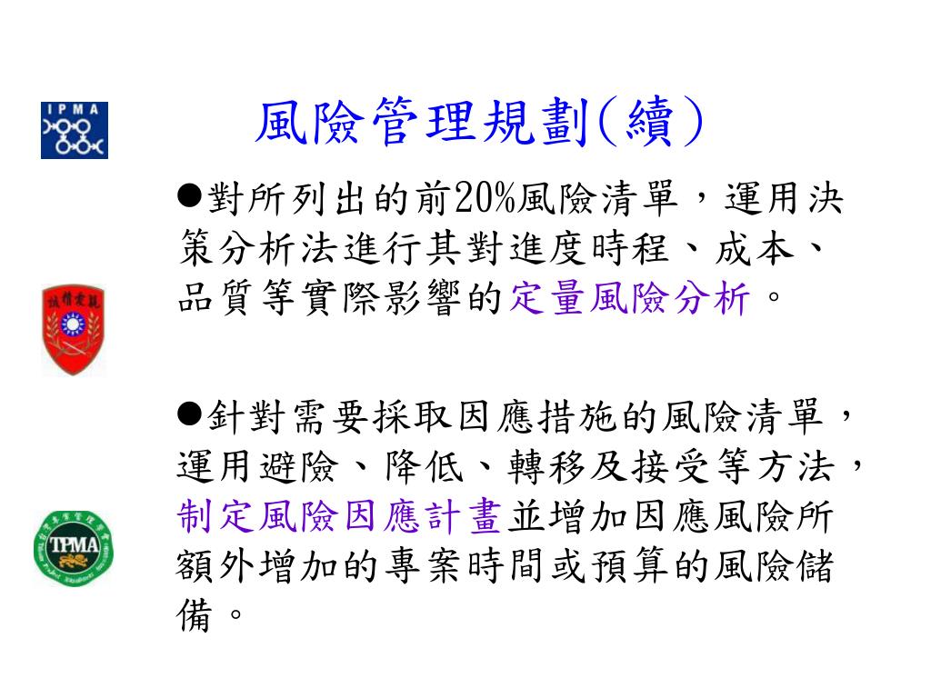 風險管理規劃(續) 對所列出的前20%風險清單,運用決策分析法進行其對進度時程、成本、品質等實際影響的定量風險分析。 針對需要採取因應措施的風險清單,運用避險、降低、轉移及接受等方法,制定風險因應計畫並增加因應風險所額外增加的專案時間或預算的風險儲備。