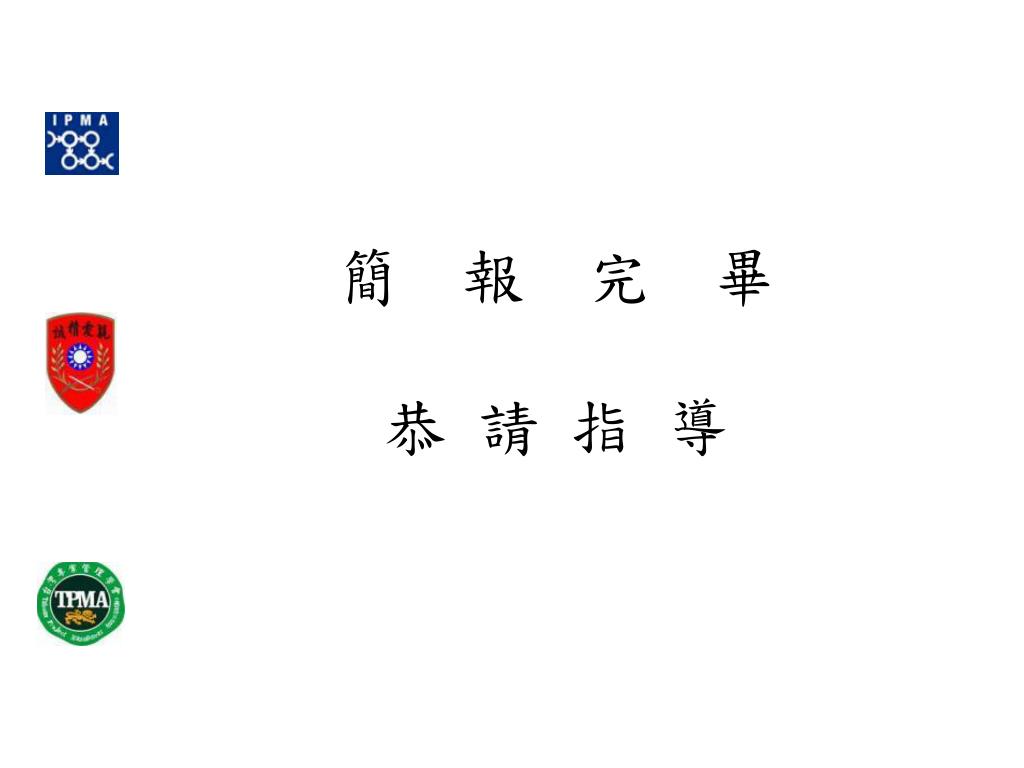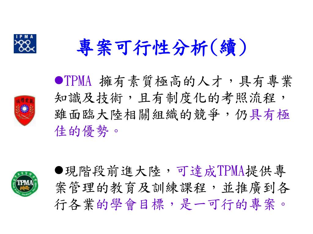 專案可行性分析(續) TPMA擁有素質極高的人才,具有專業知識及技術,且有制度化的考照流程,雖面臨大陸相關組織的競爭,仍具有極佳的優勢。 現階段前進大陸,可達成TPMA提供專案管理的教育及訓練課程,並推廣到各行各業的學會目標,是一可行的專案。