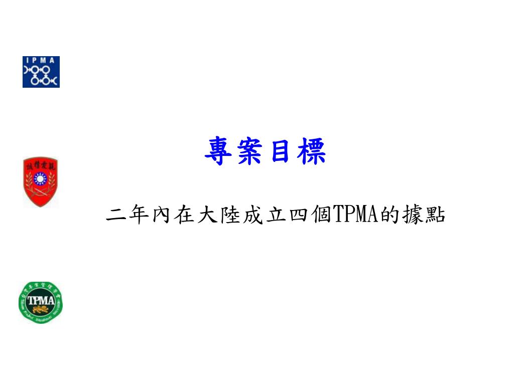 專案目標 二年內在大陸成立四個TPMA的據點