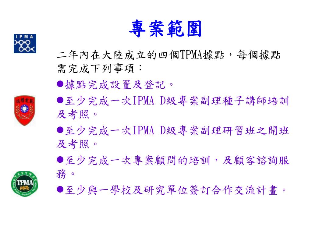 專案範圍 二年內在大陸成立的四個TPMA據點,每個據點需完成下列事項: 據點完成設置及登記。 至少完成一次IPMA D級專案副理種子講師培訓及考照。 至少完成一次IPMA D級專案副理研習班之開班及考照。 至少完成一次專案顧問的培訓,及顧客諮詢服務。 至少與一學校及研究單位簽訂合作交流計畫。