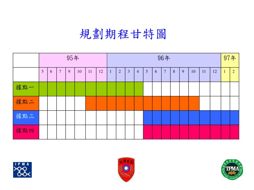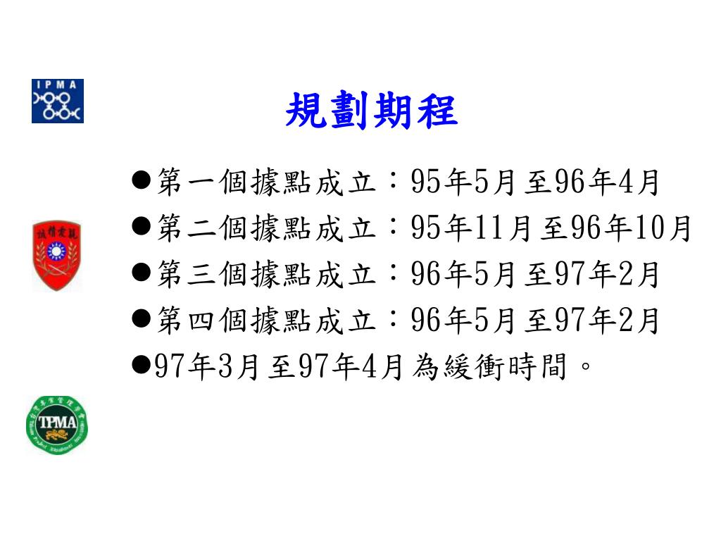 規劃期程 第一個據點成立:95年5月至96年4月 第二個據點成立:95年11月至96年10月 第三個據點成立:96年5月至97年2月 第四個據點成立:96年5月至97年2月 97年3月至97年4月為緩衝時間。