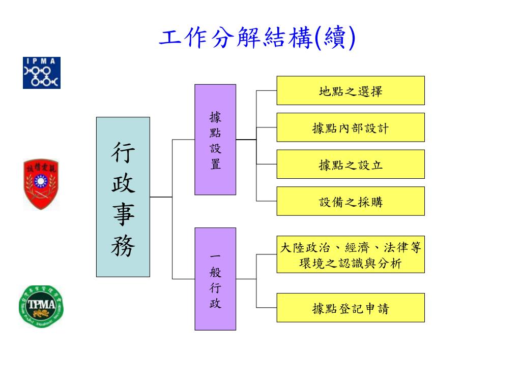 工作分解結構(續) 地點之選擇 據 點 設 置 據點內部設計 行 政 事 務 據點之設立 設備之採購 一 般 行 政 大陸政治、經濟、法律等 環境之認識與分析 據點登記申請
