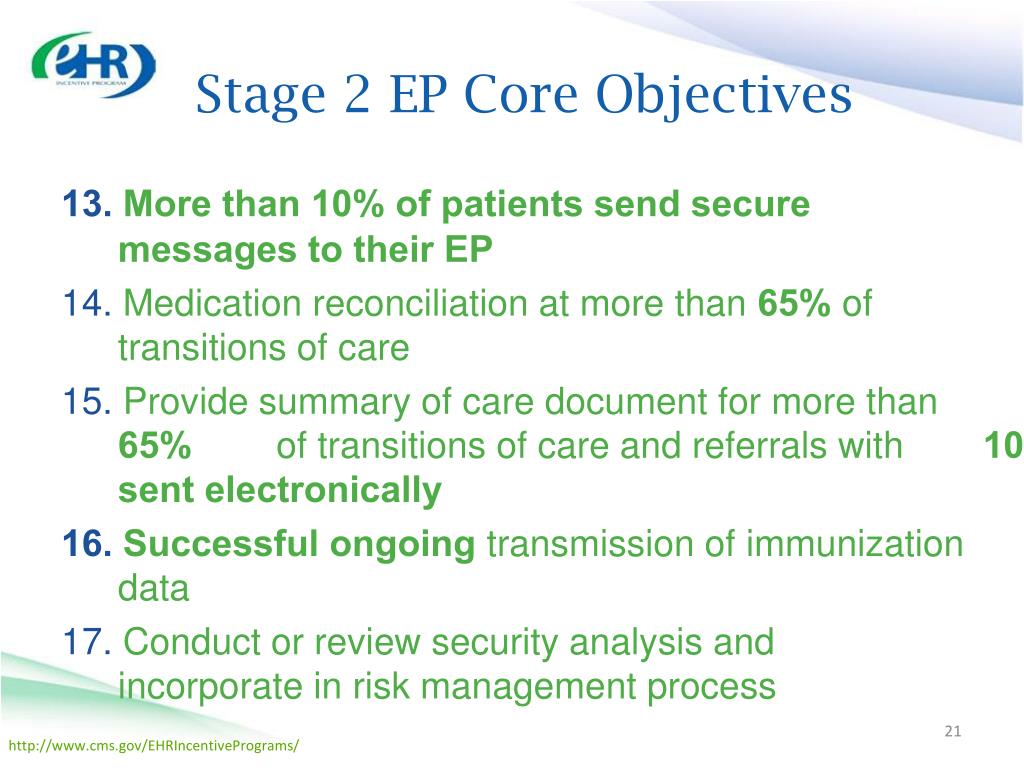 Stage 2 EP Core Objectives 8. Generate patient list by specific condition 9. Use EHR to identify and provide more than 10% with reminders for preventive/follow-up 10.Provide online access to health information for more than 50% with more than 10% actually accessing 11.Provide office visit summaries in 24 hours 12.Use EHR to identify and provide education resources more than 10% 20 http://www.cms.gov/EHRIncentivePrograms/